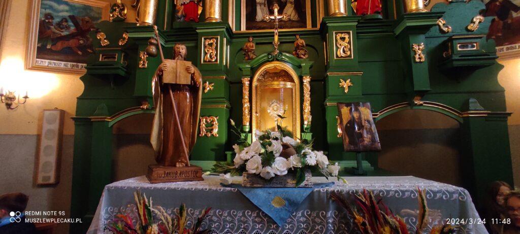 Kościół św. Jakuba Apostoła w Sączowie pękał dzisiaj w szwach i chyba nawet ksiądz proboszcz nie spodziewał się takiego tłumu. Oprócz miejscowych parafian i nas pielgrzymów, sporą grupę wiernych stanowił zespół śpiewających dzieci i młodzieży, czyli SĄCZOWSKIE WIANKI wespół z SĄCZOWSKIMI MUSZELKAMI. Zadbali oni o piękną i rozśpiewaną oprawę tej wyjątkowej, południowej mszy dedykowanej Wszystkim jakubowym pielgrzymom i tym, dla których bardzo ważny jest święty Jakub.
