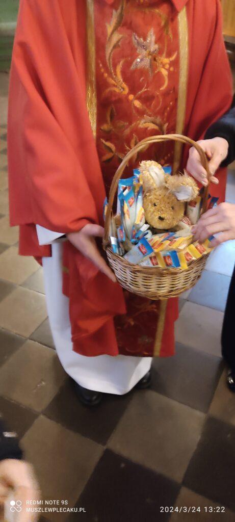 Na zakończenie nabożeństwa Wszystkie dzieci dostały od księdza proboszcza słodki podarunek z koszyczka, w którym siedział – zapewne ten właściwy – wielkanocny zajączek.