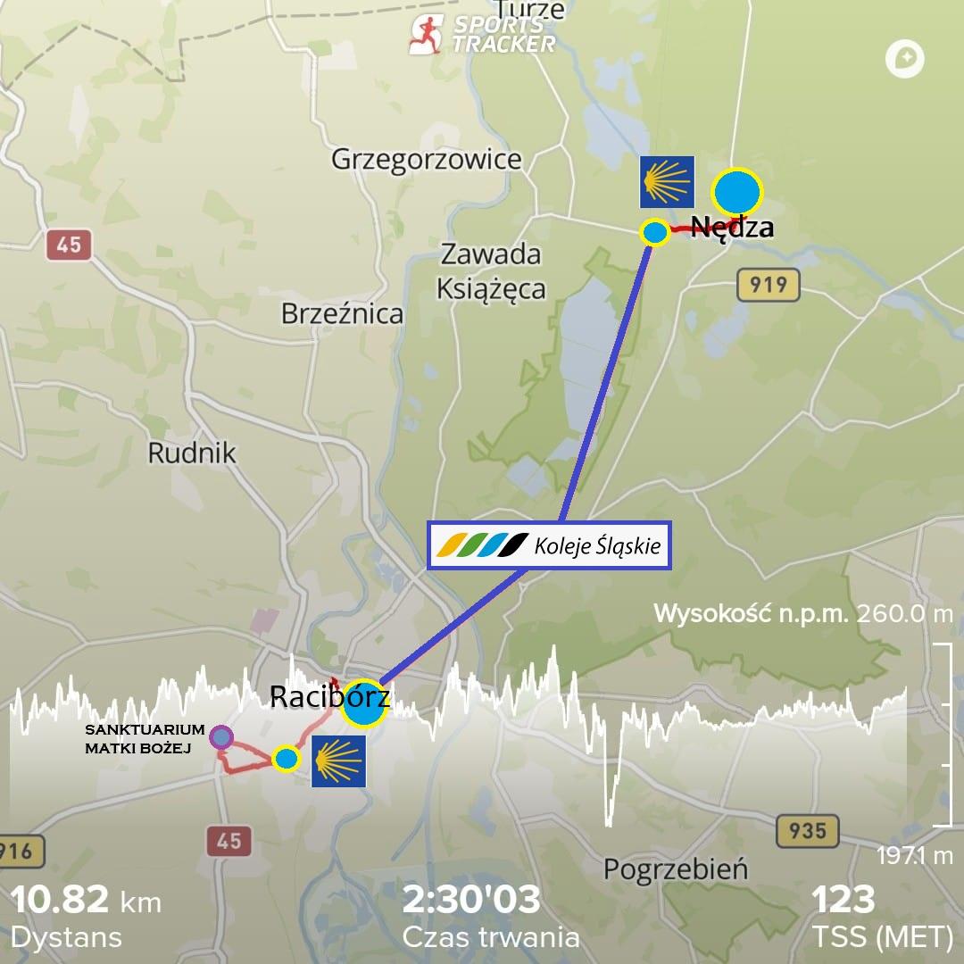 Plan naszego dzisiejszego wędrowania okrojony został do przejścia kilku kilometrów w samym Raciborzu (do Sanktuarium i droga powrotna na dworzec kolejowy) oraz do kilkunastominutowego przejścia i doglądnięcia odcinka znajdującego się w Nędzy a dokładniej Drogi jakubowej mieszczącej się między dwiema stacjami kolejowymi, znajdującymi się w tej miejscowości.